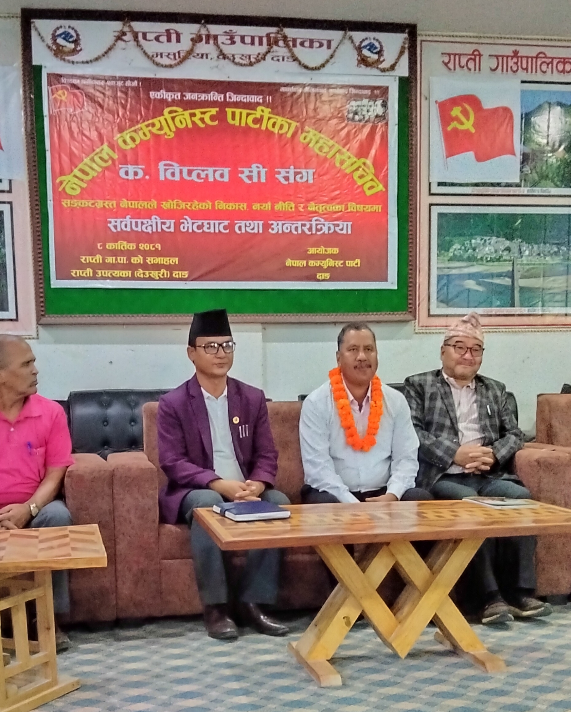 नेकपा दाङद्वारा देउखुरीको राप्ती गापाको सभाहलमा आयोजना गरिएको सर्वपक्षीय अन्तरक्रिया तथा भेटघाट कार्यक्रमलाई सम्बोधन गर्दै महासचिव विप्लवले दलहरूले जनताको भावना समेट्न नसक्दा मुलुक अस्थिरता तर्फ धकेलिन सक्ने खतरा बढेको बताए ।