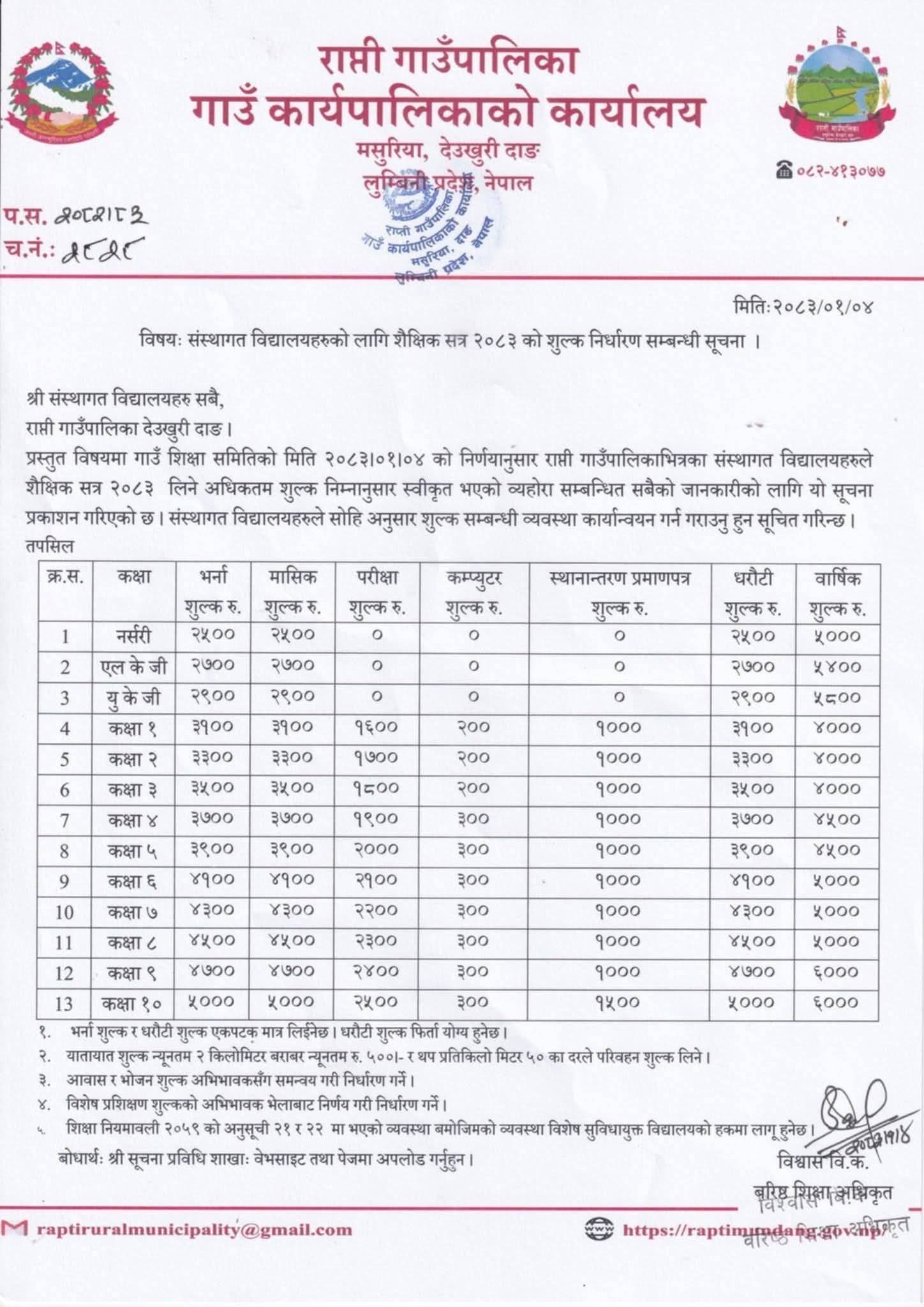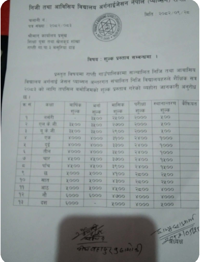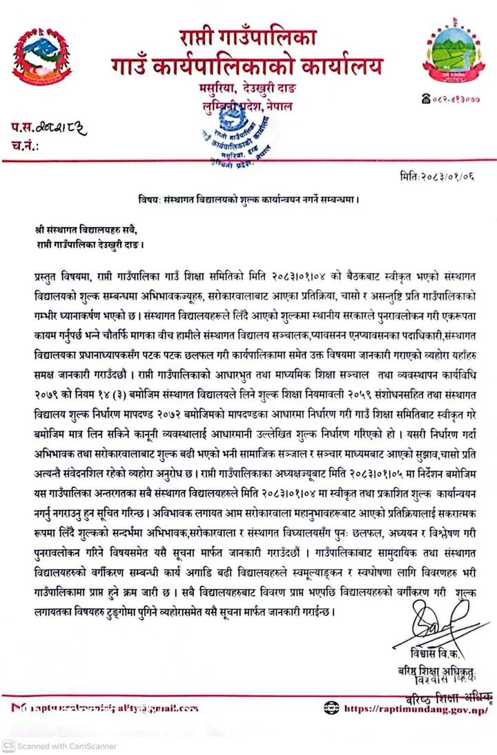गाउँपालिकाको शिक्षा शाखाले औपचारिक सूचना जारी गर्दै प्रस्तावित शुल्क हालका लागि कार्यान्वयन नगर्न सबै संस्थागत विद्यालयहरूलाई निर्देशन दिएको छ।